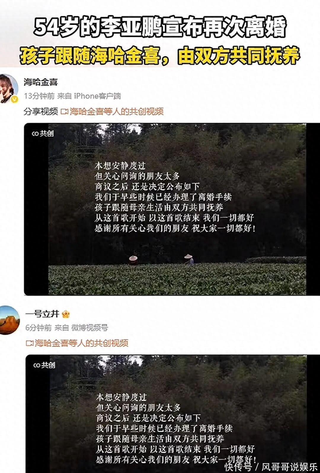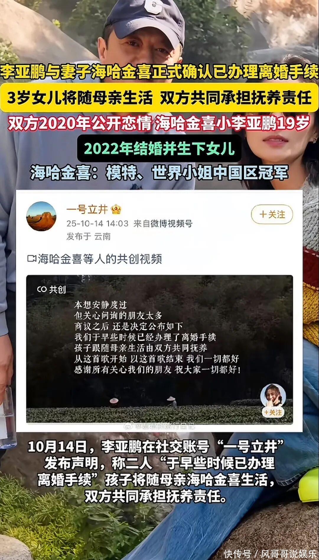 2025年10月14日,李亚鹏与妻子海哈金喜以“共创视频”形式官宣离婚。56秒短片配文“从这首歌开始,以这首歌结束”,瞬间引爆全网。