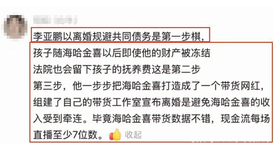 此次共创视频官宣离婚被赞“理性成熟”,明确共同抚养3岁女儿李夏,无财产纠纷(债务远超资产)。但延迟官宣被质疑或与债务处理相关,舆论推测离婚可能是“保护性切割”,避免妻女受“限高令”牵连。律师指出,若债务属李亚鹏个人投资亏损,海哈金喜本无连带偿还责任。